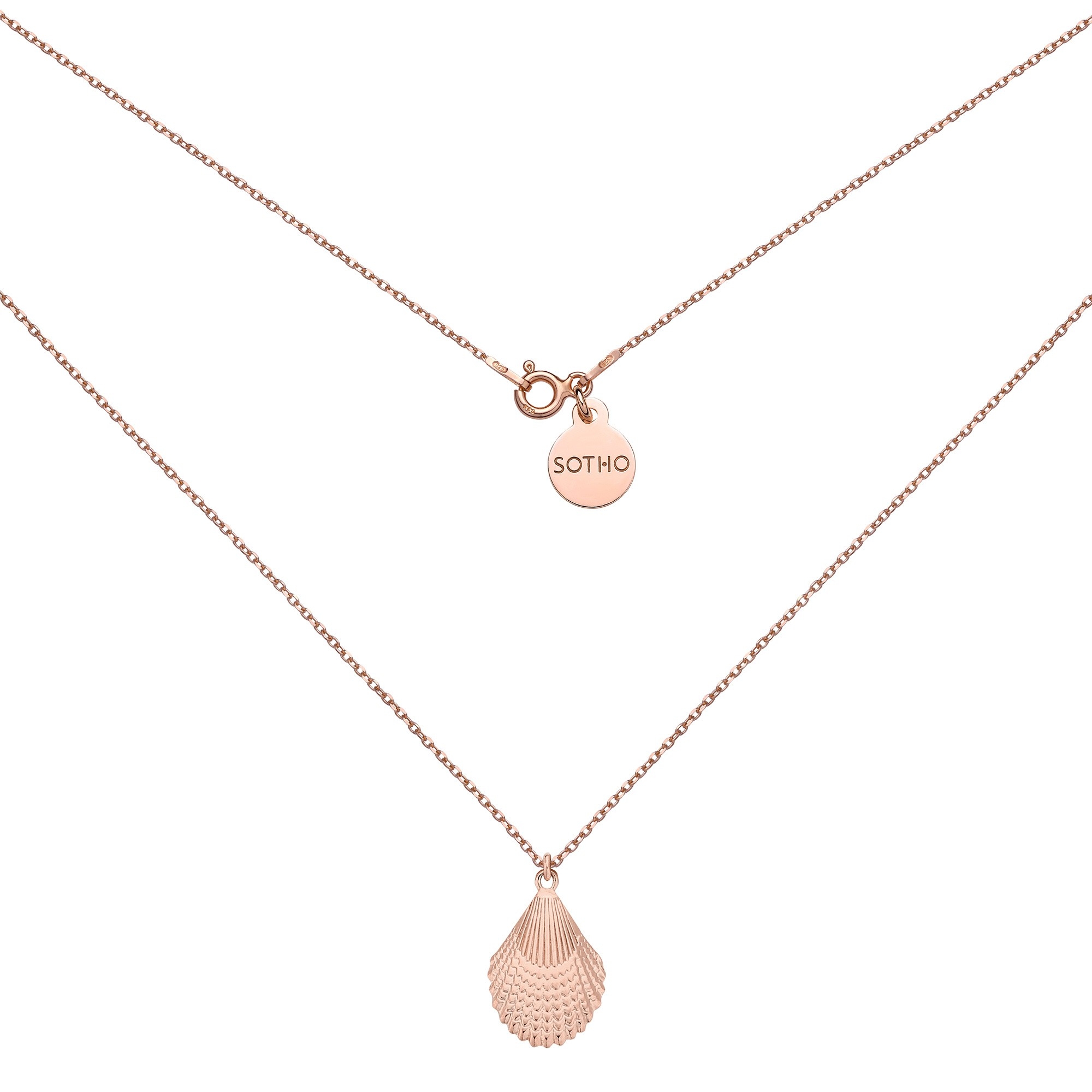 Złoty naszyjnik łańcuszkowy zdobiony muszlą i zawieszką z logo marki. Całość wykonana ze srebra 925 powlekanego 24 karatowym różowym złotem.
