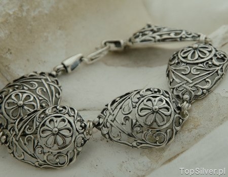Stylowa, srebrna bransoletka, w której wypukłych ogniwach zamkniety został piękny ażurowy motyw zdobniczy.