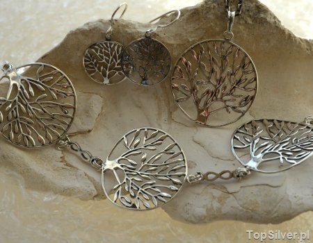Przedstawiamy zestaw biżuterii srebrnej ( w skład zestawu wchodzi: bransoleta, wisior oraz kolczyki) dla lubiących i ceniących sobie kontakt z naturą. Wizerunek ogniwa to piękne, rozłożyste drzewo liściaste opisane na okręgu. Ten motyw zdobniczy to ukłon w stronę natury oraz najpopularniejszy aktualnie trend w złotnictwie – wszystko ma się kojarzyć z naturą. A czy może być lepsze skojarzenia właśnie od takiego drzewa?