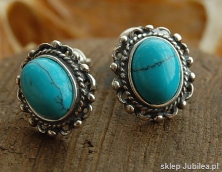 Srebrne kolczyki inspirowane motywami wzornictwa secesyjnego. Turkus stanowiący centrum kolczyka oprawiony jest w ładnie prezentującym się motywie zdobniczym.
