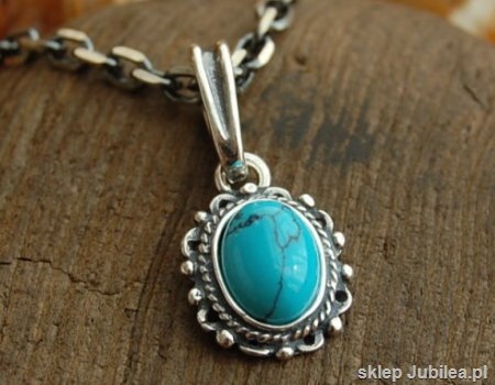 Srebrny oksydowany wisiorek, którego centrum stanowi turkus (syntetyczny), zamknięty w pięknej srebrnej oprawce.