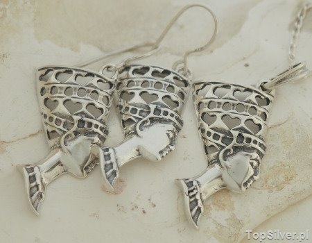 Srebrny komplet (kolczyki oraz wisiorek) – Nefretete – Nazywanej najczęściej najpiękniejszą kobietą antycznego świata. Z jej twarzy bije blask, gracja i spokój.