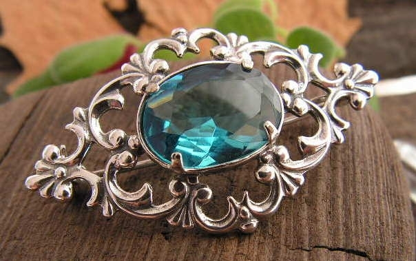 Stylowa brosza, która swój piękny wzór zawdzięcza rozkwitowi jubilerstwa w carskiej Rosji. W niepowtarzalny ornament wkomponowany jest ogromny akwamaryn (syntetyczny).