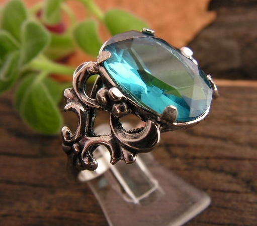 Stylowy pierścień, który swój piękny wzór zawdzięcza rozkwitowi jubilerstwa w carskiej Rosji. W niepowtarzalny ornament wkomponowany jest ogromny akwamaryn (syntetyczny).