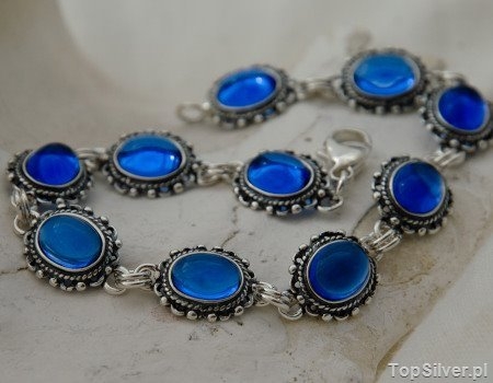 Wytworna, srebrna bransoleta w której niezwykle delikatny ażurowy wzór, wkomponowano piękne mieniące się szafiry (synt). Bransoleta składa się z dziesięciu elementów.