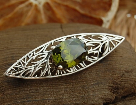 Srebrna smukła broszka w której niepowtarzalne wzornictwo zakuty został okazały oliwin.