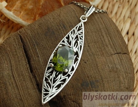 Srebrny długi wisior w którego niepowtarzalne wzornictwo zakuty został okazały oliwin.