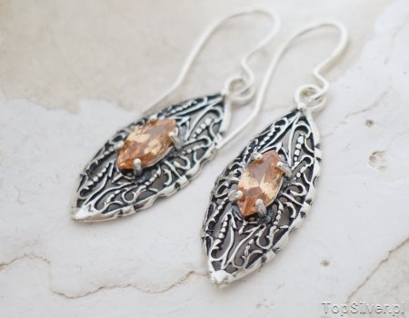 Wytworne, srebrne kolczyki – stylistyką nawiązujące do najpiękniejszego okresu dla jubilerstwa czyli secesji. W misterny a zarazem delikatny wzór wkomponowano pięknie wybarwione topazy złociste. Biżuteria wykonana została z dbałością o każdy szczegół.