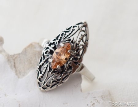 Wytworny, srebrny pierścionek stylistyką nawiązujący do najpiękniejszego okresu dla jubilerstwa czyli secesji. W misterny a zarazem delikatny wzór wkomponowano piękny topaz złocisty. Biżuteria wykonana została z dbałością o każdy szczegół.