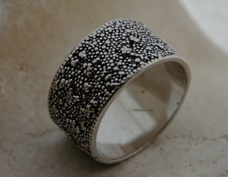 Srebrna, oksydowana obrączka, której motyw zdobniczy wyglada niczym wysypany srebrnym piaskiem.