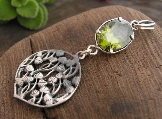 Wytworny wisior, którego secesyjne roślinne wzory wykończono starą techniką włókninowania – która nadaje srebrze satynowego powabu, całość doskonale uzupełnia pięknie wybarwiony oliwin.