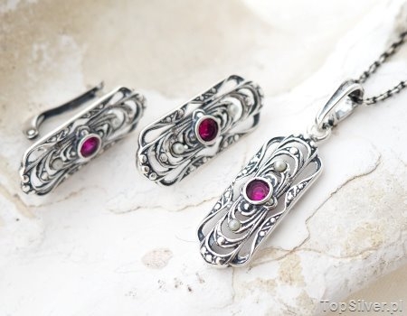 Delikatny, srebrny zestaw biżuterii (idealny na prezent) w składzie: kolczyki oraz zawieszka. Filigranowe zdobienia zostały pooksydowane, dzięki czemu biżuteria nabrała charakteru. W jej centralnym miejscu umieszczono pięknie wybarwiony rubin (synt) oraz po dwie drobne perełki naturalne.