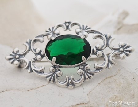 Stylowa brosza, która swój piękny wzór zawdzięcza rozkwitowi jubilerstwa w carskiej Rosji. W niepowtarzalny ornament wkomponowany jest ogromny szmaragd (synt)
