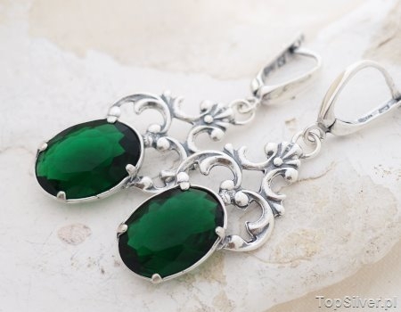 Stylowe kolczyki, które swój piękny wzór zawdzięczają rozkwitowi jubilerstwa w carskiej Rosji. W niepowtarzalny ornament wkomponowany jest ogromny szmaragd (synt).