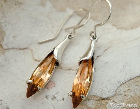 Niezwykle eleganckie aczkolwiek bardzo proste kolczyki, w których srebrną smukłą oprawkę zakute zostały podłużne, fasetowane topazy złociste (synt).