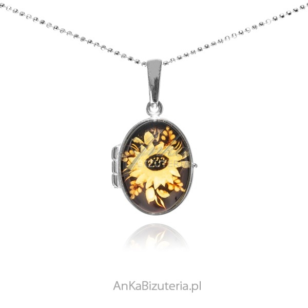 Puzderko srebrne z bursztynem , otwierane na różnego rodzaju pamiątki, zdjęcie itp.