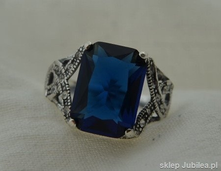 Duży pierścień na pięknych dłoniach zawsze przyciąga uwage i spojrzenia 🙂 Tak będzie i tym razem bo przedstawiany przez nas model z szafirem (synt) – taki właśnie jest! W centralnym miejscu pierścienia umieszczony został kamień w kształcie ośmiokata (oktagon), z obu stron obrączki pierścień dekorują gałązki w których obsadzone jest 9 drobnych kryształków Swarovskiego.