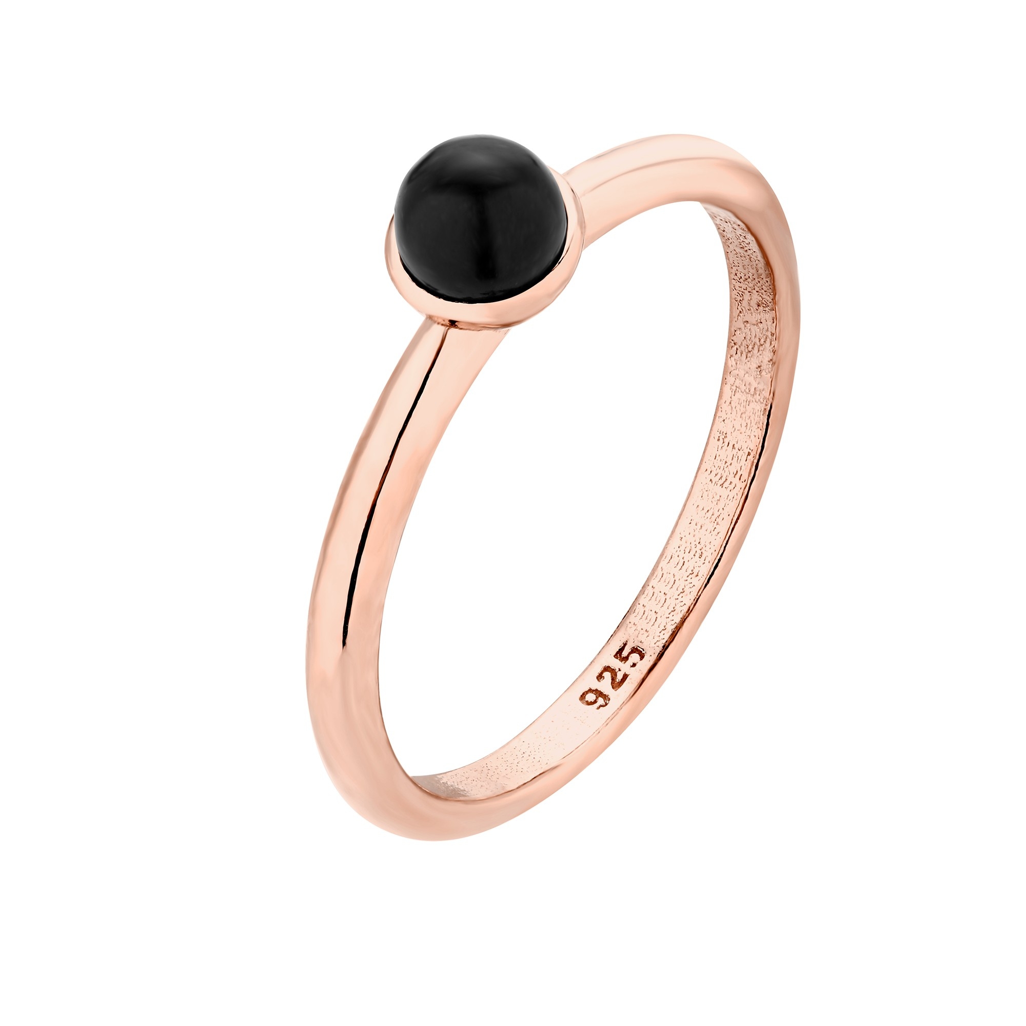 Złoty pierścionek zdobiony perłą Preciosa w kolorze czarnym. Wszystkie elementy wykonane ze srebra 925 powlekanego 24 karatowym różowym złotem.