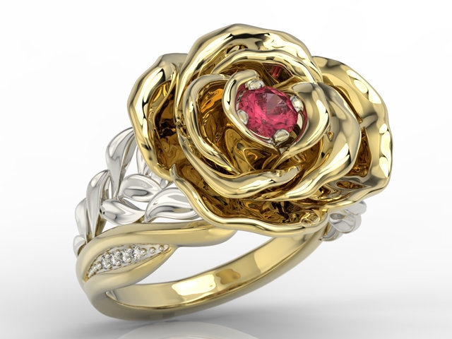 Pierścionek z żółtego i białego złota w kształcie róży z rubinem i cyrkoniami AP-95ZB-C