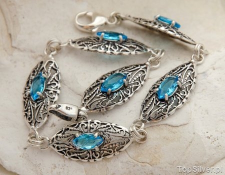 W każdym z sześciu elementów bransoletki zakuty został akwamaryn. Z całą pewnością bransoletka posiada magię przyciągania spojrzeń. Sama się o tym przekonaj.