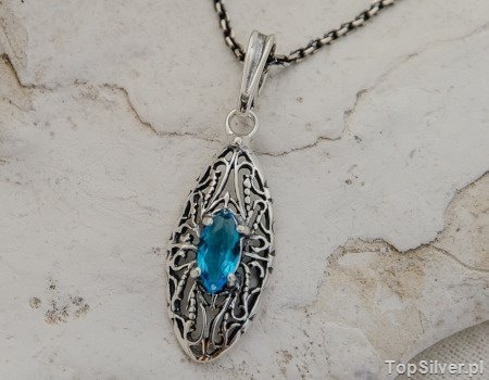 Delikatny, srebrny wisiorek, którego wzornictwo inspirowane było secesyjnymi motywami zdobniczymi. W filgranowym dekorze wisiorka zakuty został akwamaryn.