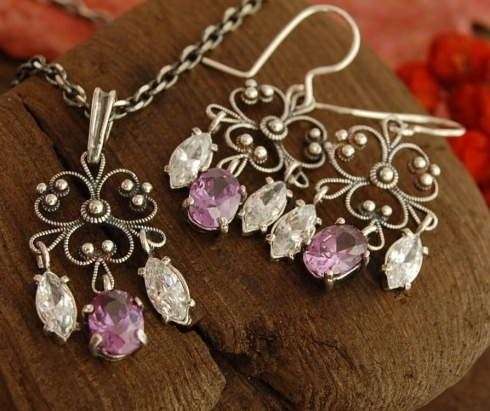 Wytworny, srebrny, oksydowany zestaw w składzie kolczyki i wisiorek. W którym do płatków filigranowego kwiatka przymocowano pięknie połyskujące kamienie: ametyst i kryształki Swarovskiego.