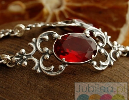 Uwielbiasz biżuterię rodem z carskiej Rosji? Jeśli tak koniecznie poznaj prezentowaną niezwykłą bransoletkę z rubinem. Ogromny kamień wkomponowany w srebrny ornament prezentuje się naprawdę zjawiskowo. Bransoleta o długości 19,8 cm z łatwością stanie się ozdobą każdej wyjątkowej stylizacji.