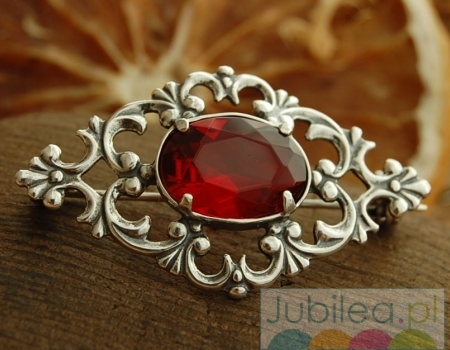 Stylowa brosza, która swój piękny wzór zawdzięcza rozkwitowi jubilerstwa w carskiej Rosji. W niepowtarzalny ornament wkomponowany jest ogromny rubin (syntetyczny).