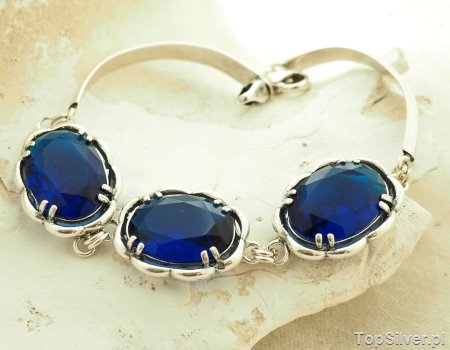 Srebrna bransoleta, inspirowana wzorami z okresu świetności Art deco w jubilerstwie, to z pewnością wspaniale wyglądający przedmiot. A połączenie kamieni (szafir synt.) oraz srebra to para która przebojem wdarła się do klasyków biżuterii. Piękny niebieski kolor kamienia w połączeniu z połyskującym na biało srebrem to kompozycja, która wprawi w zachwyt każdą miłośniczkę błyskotek 🙂