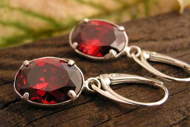 Delikatne, aczkolwiek bardzo eleganckie kolczyki, w których najważniejszą i najbardziej przykuwającą uwagę częścią jest mistrzowsko wyszlifowany granat (syntetyczny), zakuty w srebrną oprawkę.