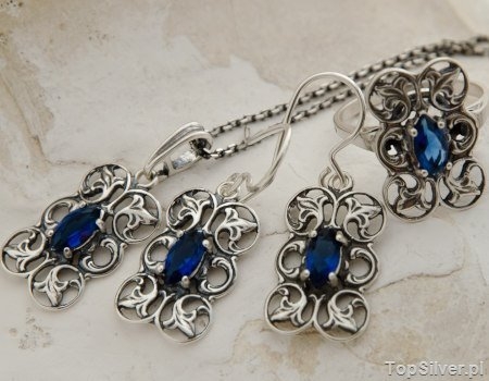 Wytworny, srebrny zestaw biżuterii w składzie:  kolczyki, wisiorek oraz pierścionek  – stylistyką nawiązujące do najpiękniejszego okresu dla jubilerstwa czyli secesji. W symbolizyjące roślinne gałązki, wkomponowano pięknie wybarwione szafiry. Biżuteria wykonana została z dbałością o każdy szczegół.