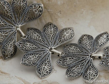Okazała srebrna bransoleta wykonana z sześciu pięknych, oksydowanych elementów wypełnionych mistrzowsko wykonanym ażurowym ornamentem.