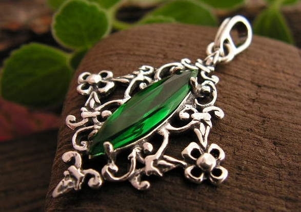 W OKSYDOWANY MOTYW ZDOBNICZY WISIORA ZAKUTY ZOSTAŁ FASETOWANY SYNTETYCZNY SZMARAGD.