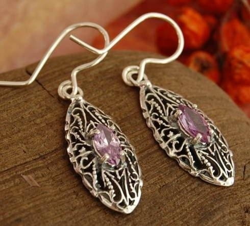 Wytworne, srebrne kolczyki – stylistyką nawiązujące do najpiękniejszego okresu dla jubilerstwa czyli secesji. W misterny a zarazem delikatny wzór wkomponowano pięknie wybarwione ametysty (syntetyczne). Biżuteria wykonana została z dbałością o każdy szczegół.