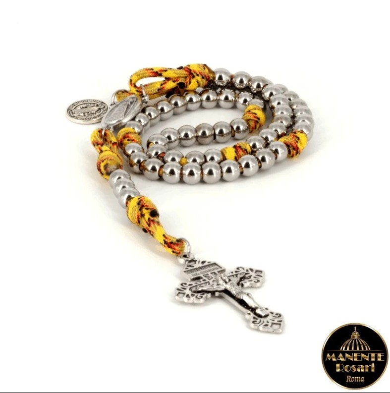 To najtrwalszy różaniec wykonany całkowicie rącznie na sznurku Paracord 550 – czyli linka spadochronowa – to linka nylonowa o wyjątkowych właściwościach, pochodzenia wojskowego, zwykle używana w spadochronach.