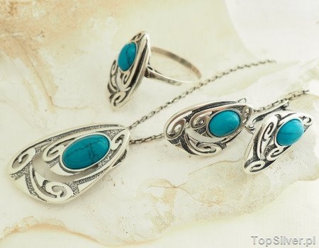 Piękny srebrny zestaw biżuterii (kolczyki, wisior oraz pierścień), inspirowany osiągnięciami imperium biznatyjskiego. W misterne i oryginalne zdobienia wkomponowano turkusy.