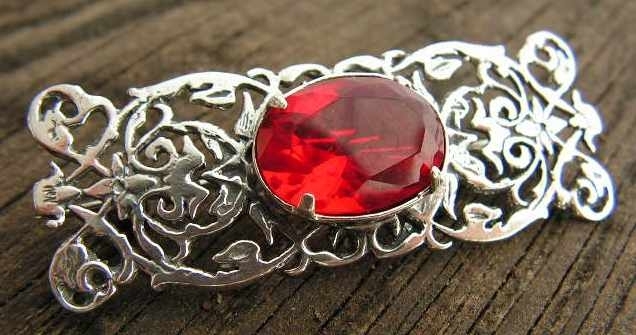 Piękna stylowa srebrna brosza, w której misterny ażur został zauty piękny rubin (syntetyczny).