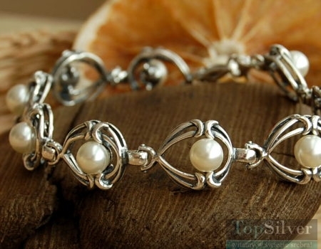 Stylowa srebrna bransoleta składająca się dziwięciu identycznych oksydowanych elementów, w każdym obsadzona została perła (syntetyczna).