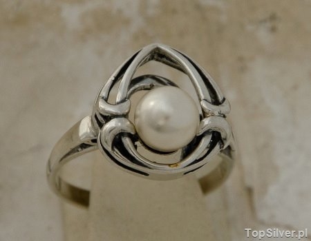 Orginalny srebrny pierścionek, w którego niepowtarzalny wzór została wkomponowana perła (synt).