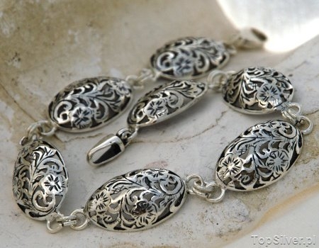 Przedstawiamy Państwu, srebrną bransoletkę której ażurowy wzór nawiązuje do okresu świetności jubilerstwa secesyjnego. Przedstawione motywy roślinne w owalnym kształcie pojedyńczego ogniwa, to powrót do biżuterii jaką nosiły nasze babcie. Nie oznacza to jednak, że taką bizuteria jest niemodna. Przeciwnie, wykonana ze szlachetnego kruszcu, jest bardzo trwała, a połyskujące, oksydowane srebro pasuje właściwie do każdej kreacji. Bransoleta pięknie prezentejue się na nadgarstku.
