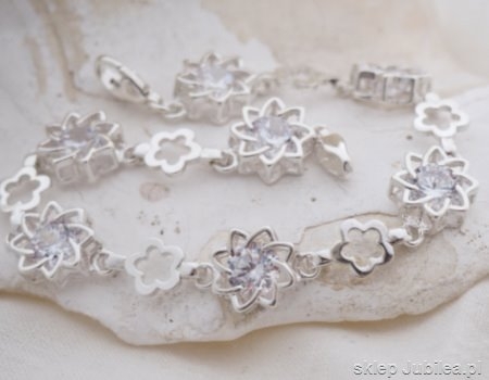 Srebrna bransoletka składająca się z siedmiu ogniw w których zakute zostały okrągłe cyrkonie. Każdy element ogniwa z zakutą cyrkonią przypomina pąk kwiatu. Dodatkowo pomiędzy takimi ogniwami umieszczone zostały drobniejsze kwiatki tylko ze srebra. Sposób mocowania wzbudza zainteresowanie i przyciąga spojrzenia. Wykończenie biżuterii to wysoki połysk.