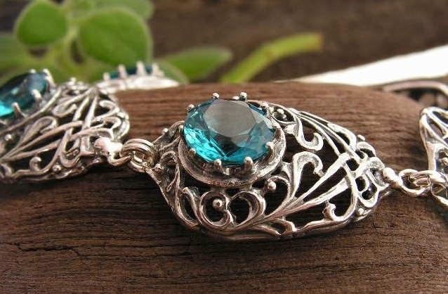 Stylowa srebrna bransoleta w której każda kobieta poczuje się wyjątkowo. W orginalny wzór nawiązaujący do jubilerstwa carskiej Rosji wkomponowano pięknie wybarwione akwamaryny.