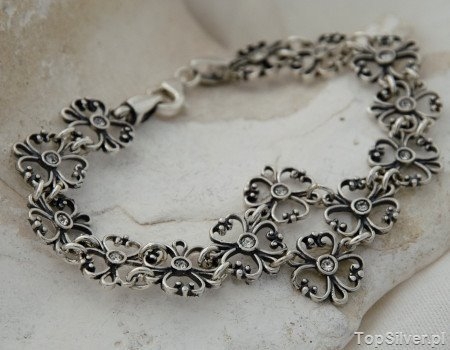 Przedstawiamy delikatna srebrną bransoletkę składającą się z czternastu ogniw w kształcie kwiatków, w centrum których wprawiono drobne kryształki Swarovskiego. Bransoletka z środku długości delikatnie sie rozszerza tworząc interesujący ażurowy wzór.