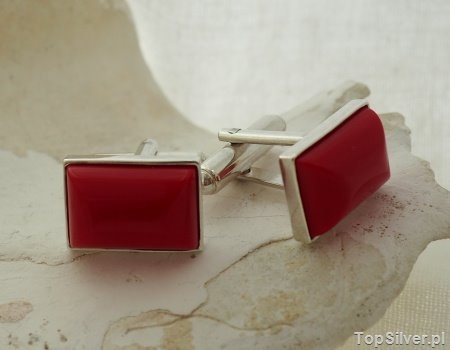 Srebrne spinki do mankietów, których motywem przewodnim jest piękny porstokątny koral.