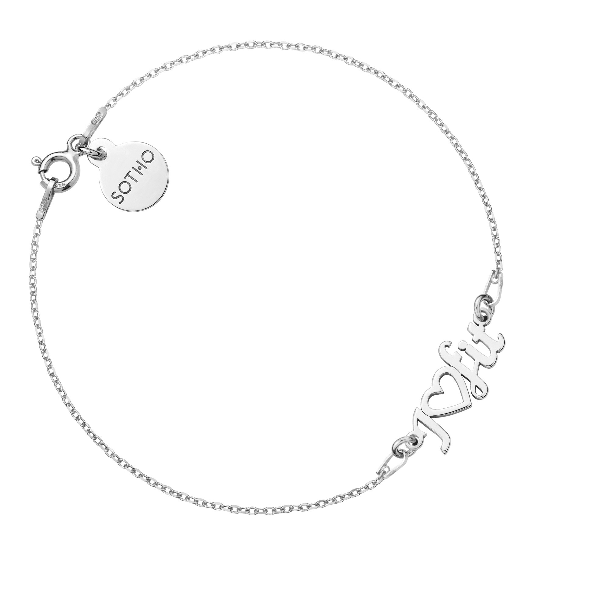 Srebrna bransoletka łańcuszkowa zdobiona napisem I Love Fit i zawieszką z logo marki. Całość wykonana ze srebra 925.