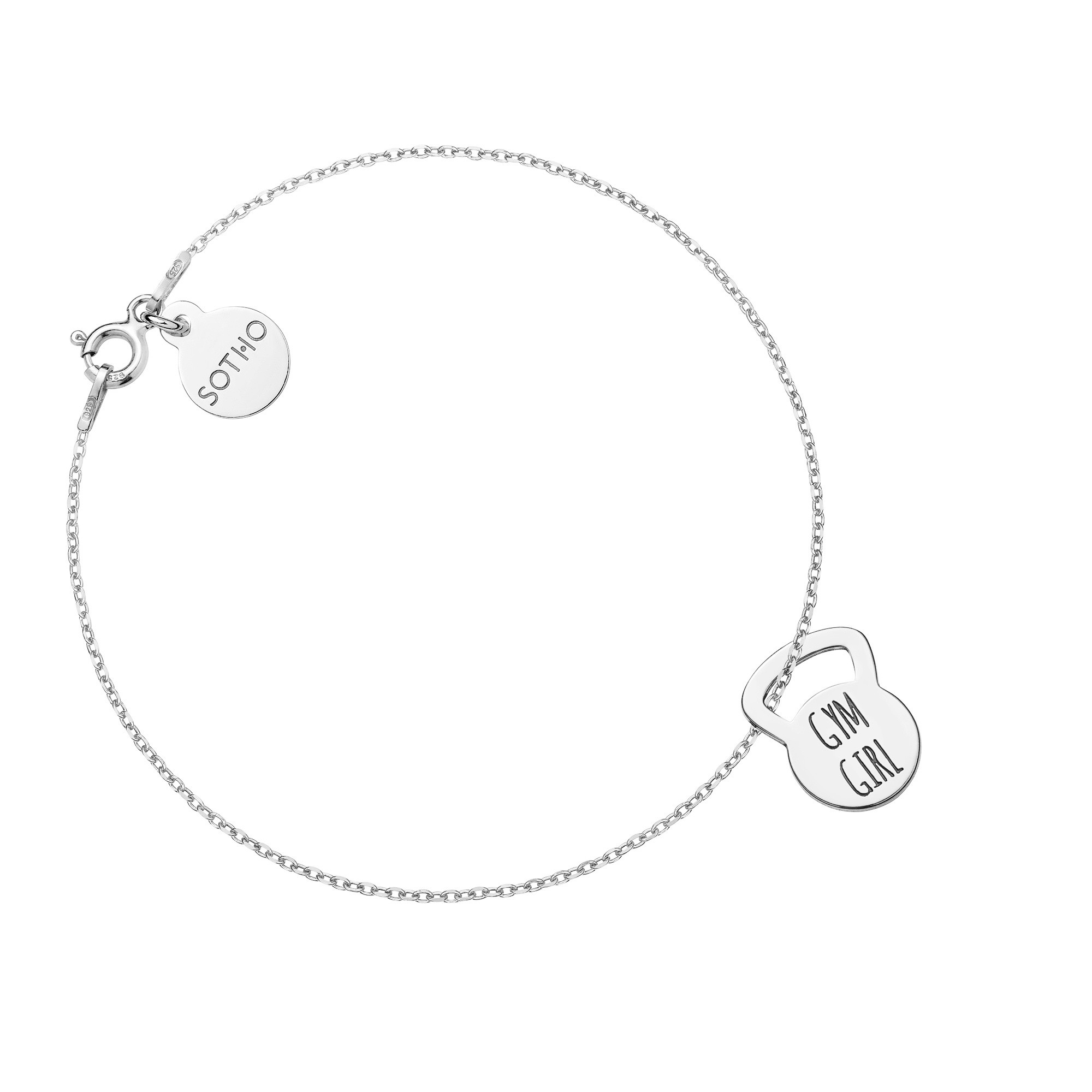 Srebrna bransoletka łańcuszkowa zdobiona ciężarkiem kettlebellem i zawieszką z logo marki. Całość wykonana ze srebra 925.