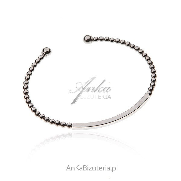 Wyjątkowa bransoletka typu bangle, zaprojektowana z niewielkich kuleczek z blaszką umiejscowioną w centralnej części. Modna i wygodna zarazem, wyróżniająca się skromnością i elegancją. Produkt wysokiej próby, wykonano z rodowanego, wytrzymałego srebra o polerowanej powierzchni. Doskonale mieni się w promieniach słonecznych, dlatego ozdoba polecana jest w codziennym użytkowaniu. Minimalizm i włoski charakter całości to dedykacja dla wymagających pań w każdym wieku.