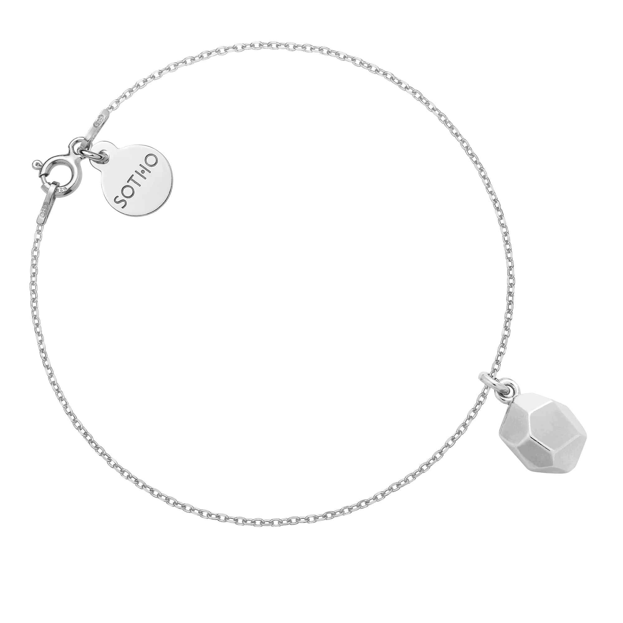 Srebrna bransoletka łańcuszkowa zdobiona bryłą geometryczną i zawieszką z logo marki. Całość wykonana ze srebra 925.
