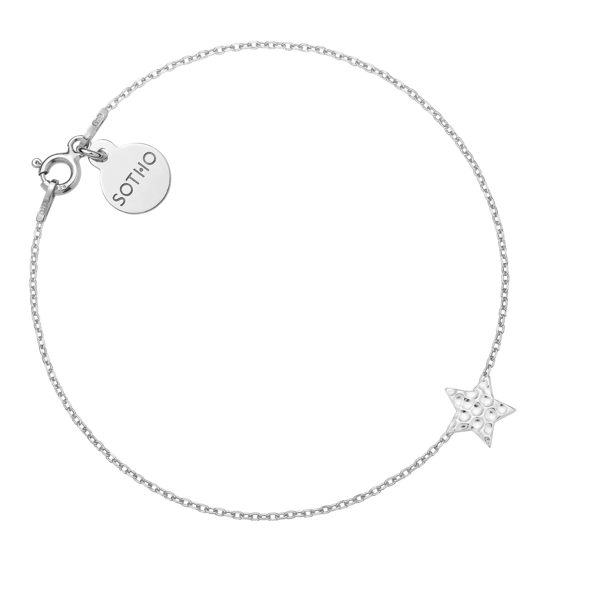 Srebrna bransoletka łańcuszkowa zdobiona chropowatą przestrzenną gwiazdką zawieszką z logo marki. Całość wykonana ze srebra 925.
