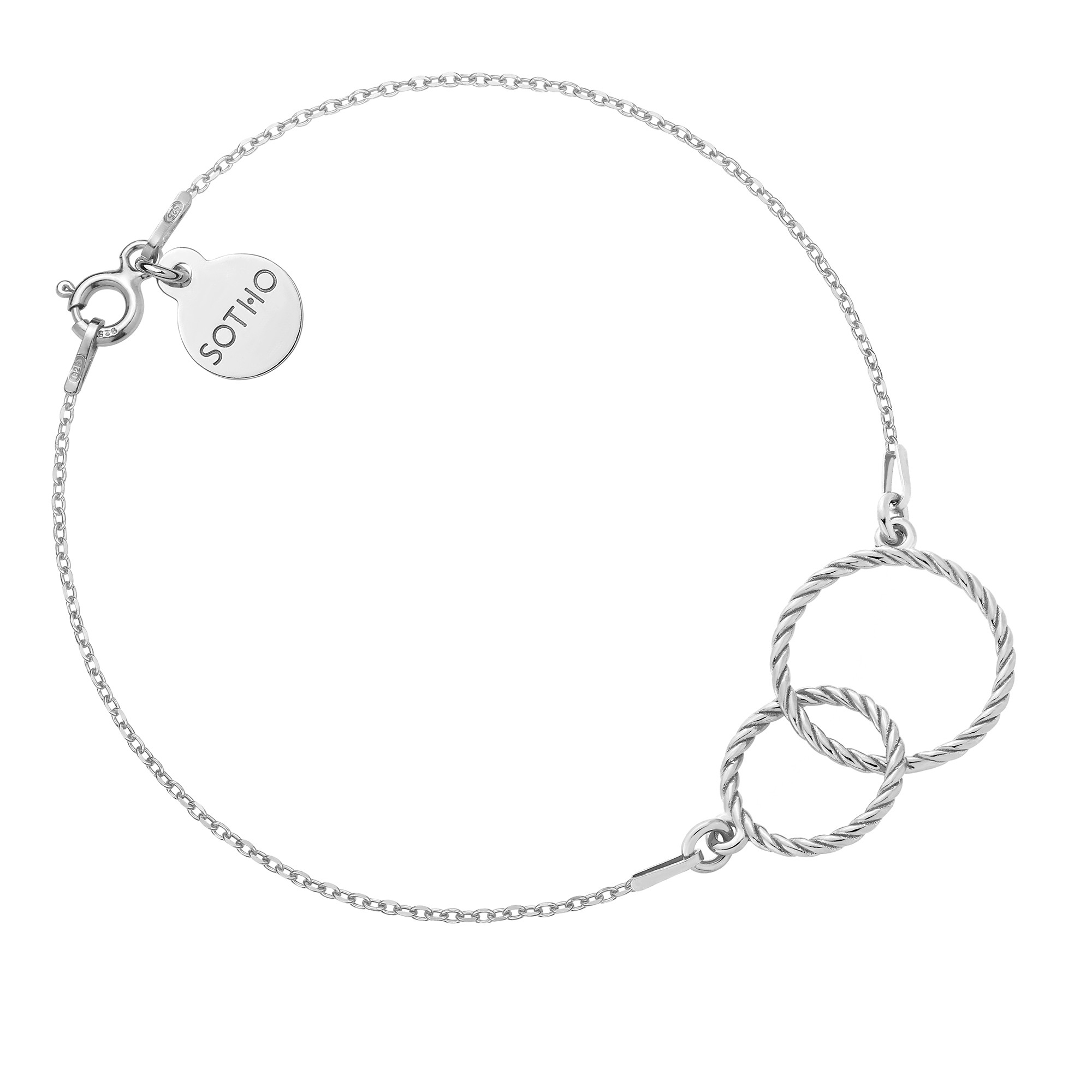 Srebrna bransoletka z dwoma obręczami i zawieszką z logo marki. Całość wykonana ze srebra 925.